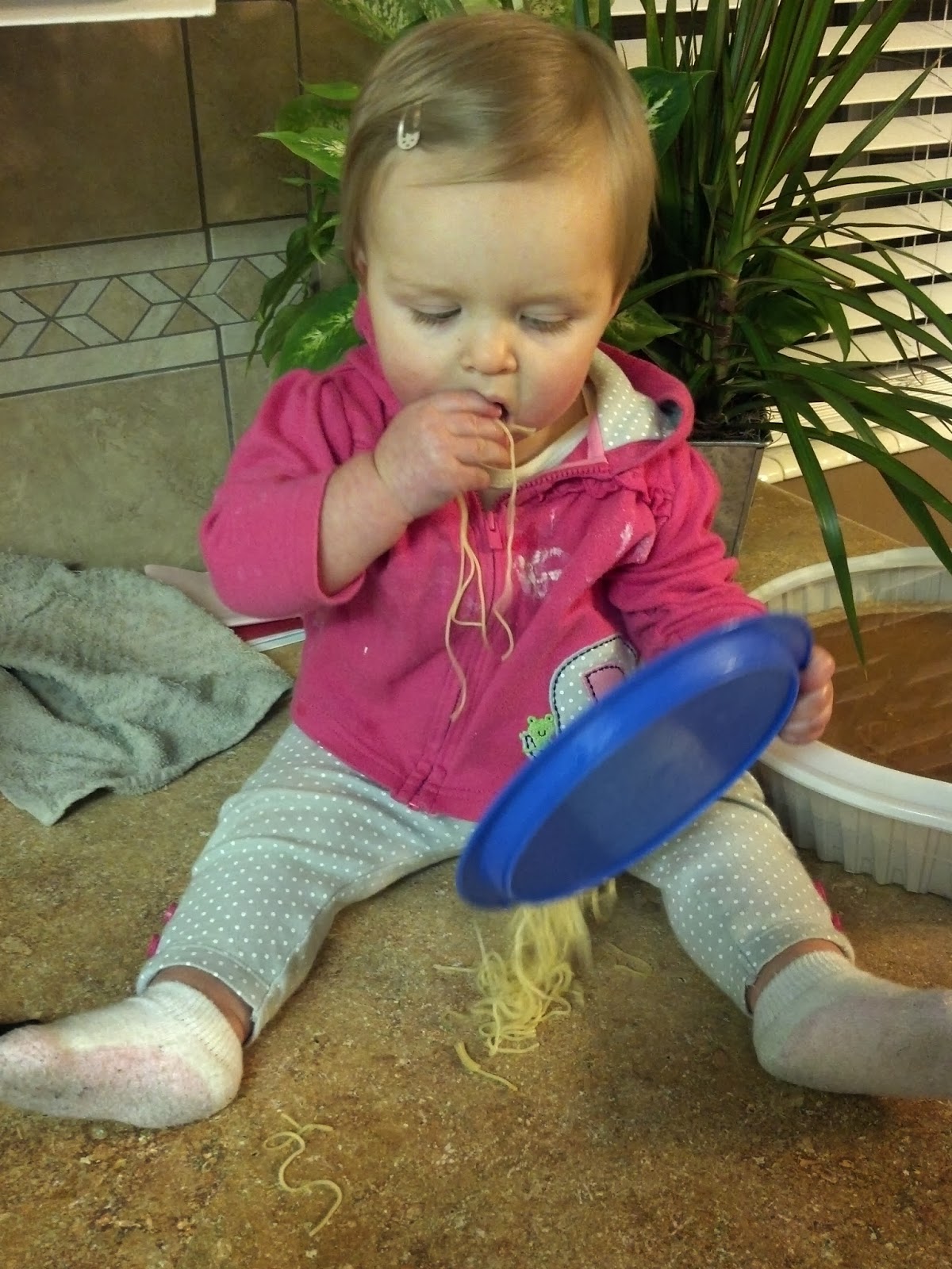 One of her new favorite things is spaghetti noodles. She loves just grabbing them and slurping them up.